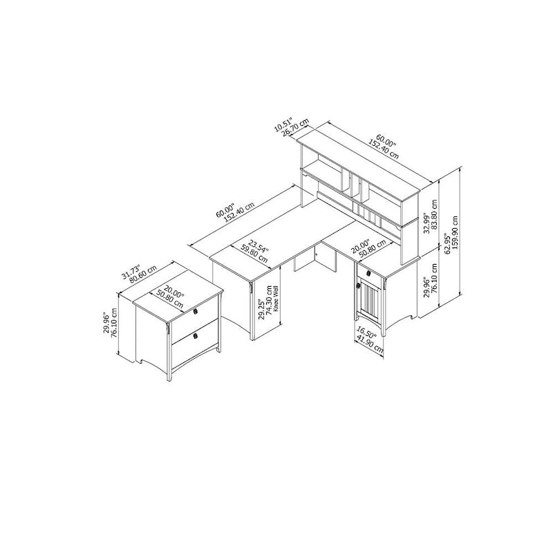 Featuring a comfortable design and plenty of storage capacity, the Bush Furniture Salinas 60W L Shaped Desk with Hutch and Lateral File Cabinet offers an ideal home office solution for those who value both style and function. Tapered legs, curved base rails and decorative wood accents inspired by timeless Mission styling create a casual feel in your home. You'll love all the room you have to multitask on the L Shaped surface, designed to save space by fitting into a corner. Have a cup of coffee as you surf the net, pay bills, read a good book or the morning paper, and enjoy all the legroom you need with the open design. Store writing utensils and small office supplies in the convenient box drawer and keep larger items in a storage cabinet with an adjustable shelf. The 60W Hutch attaches to either side of the corner desk to add plenty of storage for books, photos, decorations and more. Two large open cubby areas on either side hold bigger items, and a pair of smaller spaces in the middle are perfect for storing work-in-progress. The 2 drawer filing cabinet opens on smooth full-extension ball bearing slides for an easy reach to legal and letter size documents. Tumbled Pewter drop pull hardware complements your choice of appealing Antique White, Cape Cod Gray and Vintage Black finishes. This modern farmhouse style home office furniture set is tested to meet ANSI/SOHO quality standards for safety and performance and is backed by the Bush Furniture 1 Year Manufacturer's Warranty.