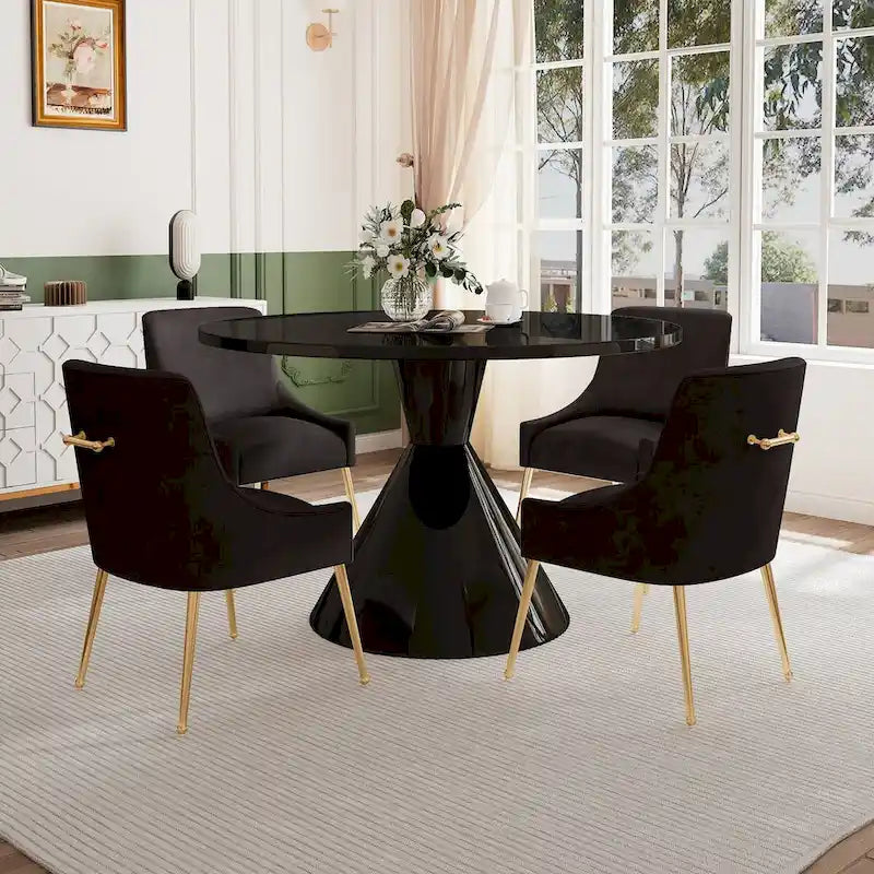 The Light Luxury Black High Gloss Countertop Dining Table with Velvet Dining Chair Set is a sophisticated and tasteful choice. It combines luxury, comfort and character, bringing a mysterious and desirable atmosphere to your dining area. Whether you are dining at home or in a commercial setting, this combination creates a regal, unique and memorable dining experience!