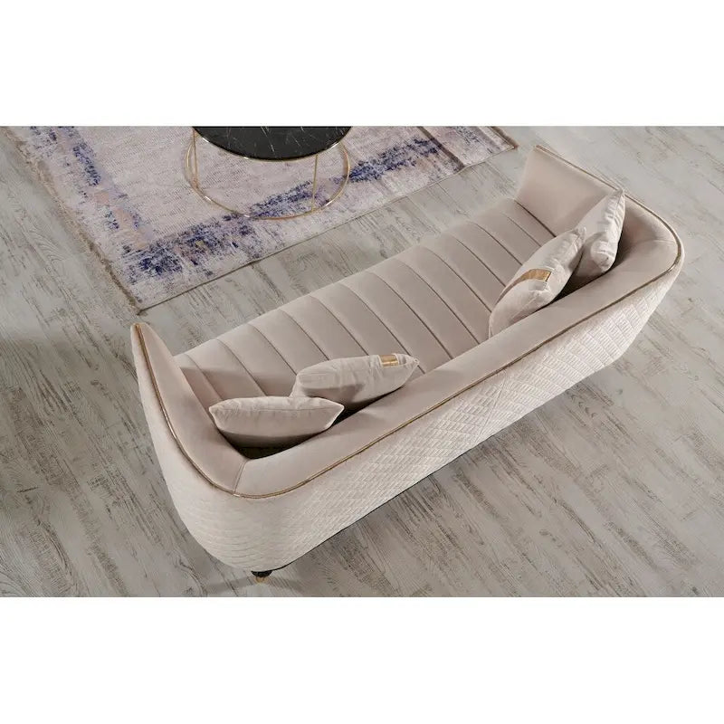 This product is expertly designed to offer a comfortable and luxurious seating experience. Its soft, easy-to-clean fabric ensures long-lasting comfort, making it ideal for relaxation or social gatherings. The plush cushions and armrests are elegantly adorned with golden accents, adding a touch of sophistication and enhancing the overall aesthetic appeal of the piece.