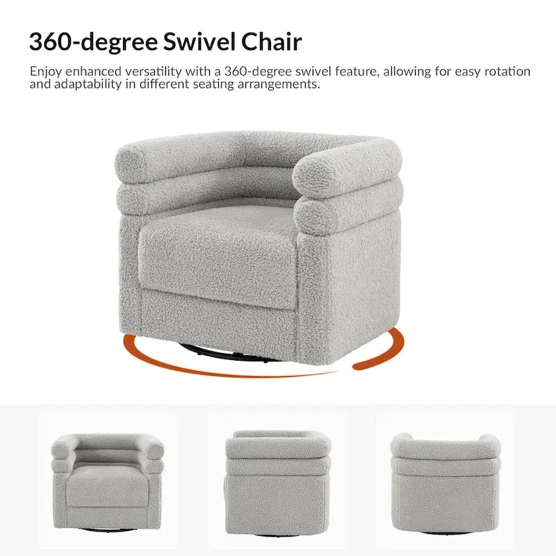 The modern barrel chair effortlessly combines a chic design with a handsome silhouette, offering a luxurious seating experience. It features a 360-degree swivel allowing for versatile movement and interaction. This sophisticated chair comes complete with a plush pillow, enhancing comfort and style. Wrapped in soft chenille fabric, the chair not only exudes elegance but also provides a cozy retreat. The attention to detail in both form and function makes this barrel chair a standout piece, making it suitable for various settings, from the vibrant ambiance of the living room to the serene comfort of the bedroom. Elevate your space with this tastefully crafted chair that seamlessly merges modernity and sophistication.