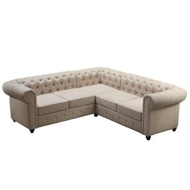 Sink into the comfort of our Moser Bay Garcia Collection 5 Seat Sectional Sofa Set. With its high scroll arms and deeply tufted upholstery, this sofa set is the epitome of coziness. The exquisite linen fabric has a detailed texture that accentuates the natural variations unique to each hide spot. The thick cushions provide optimal seating comfort. Our sectional sofa set is perfect for relaxing with family and friends.