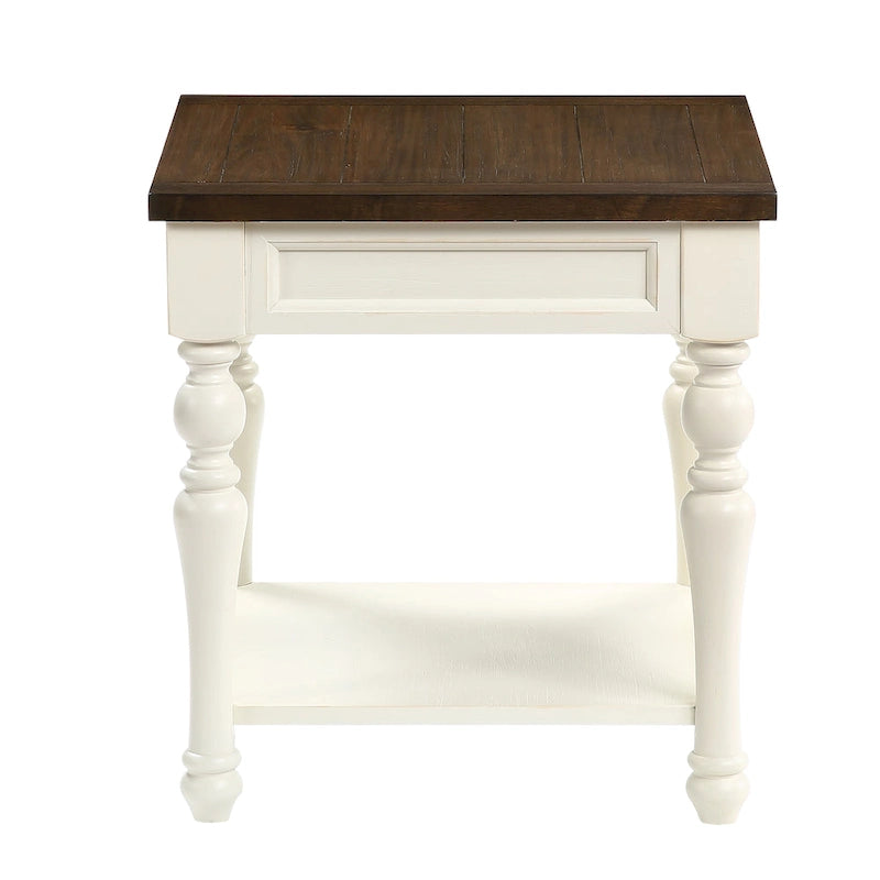 Enhance your farmhouse style with this two-tone ivory and mocha wood occasional set. The planked, butcher block style tops feature a rich brown mocha wood finish that looks great with the ivory base. Stylish picture frame moldings surround the apron and elegant turned legs add to the cottage style. A spacious lower shelf is perfect for storage or use can be used for display. Rolling casters provide easy movement for the coffee table. A single drawer in the end table offers hidden storage, perfect for keeping remote controls handy. Your purchase includes one (1) coffee table, and two (2) end tables.