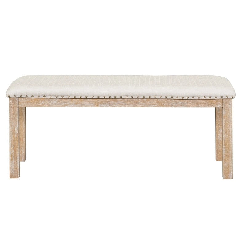 [Practical &Solid Dining Set] The dining set includes 1 extendable dining table with two 11 inch removable leaves, 4 chairs and 1 long bench which will be enough for 6 people. All of the table and chair legs are constructed with solid acacia wood which features with stability and durability. The table legs are about 3.54 inch which makes it sturdy and tactile. Also, both chairs and bench are padded with upholstered, keep you perfect dining experience.