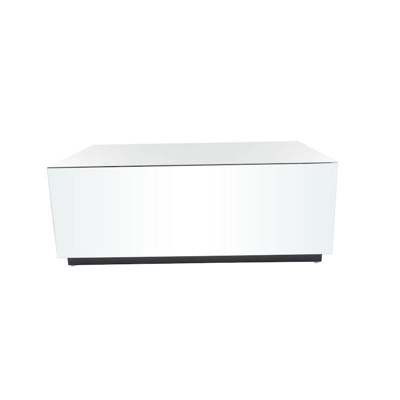 - As a feature-rich glass coffee table, it boasts a rectangular shape with a sophisticated wood structure, securely attached to reflective mirror panels and supported by a wide, stable black base