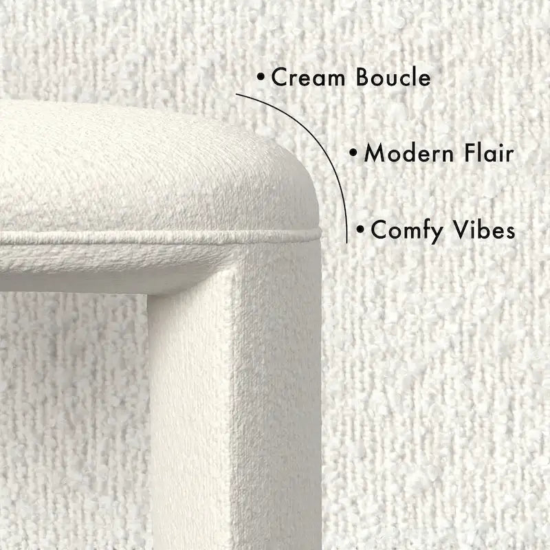 Meet the Quinn Ottoman - it's the perfect blend of modern flair and comfy vibes. Covered in a soft textural cream boucle fabric, it's like a big cozy hug for your feet. And get this, it's not just for putting your feet up - it can double as a coffee table or provide extra seating when your crew drops by. Plus, it won't hog all your floor space! No assembly required.