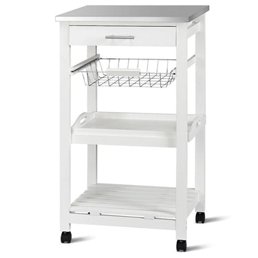 Whether you want an additional work surface, to get organized, or simply need a way to maximize your existing space, this kitchen trolley is the answer. This stylish and versatile 4-tier rolling kitchen trolley cart includes drawer, removable tray, basket and fancy rack to provide more storage room. Made from solid white MDF frame and topped with stainless steel, it offers sturdy construction and a sophisticated look for any kitchen. And the four wheels are flexible enough to move to any corner, the two lockable wheels enable stability of the kitchen cart at all time. Its not just restricted to the kitchen, use it anywhere that is convenient for you!