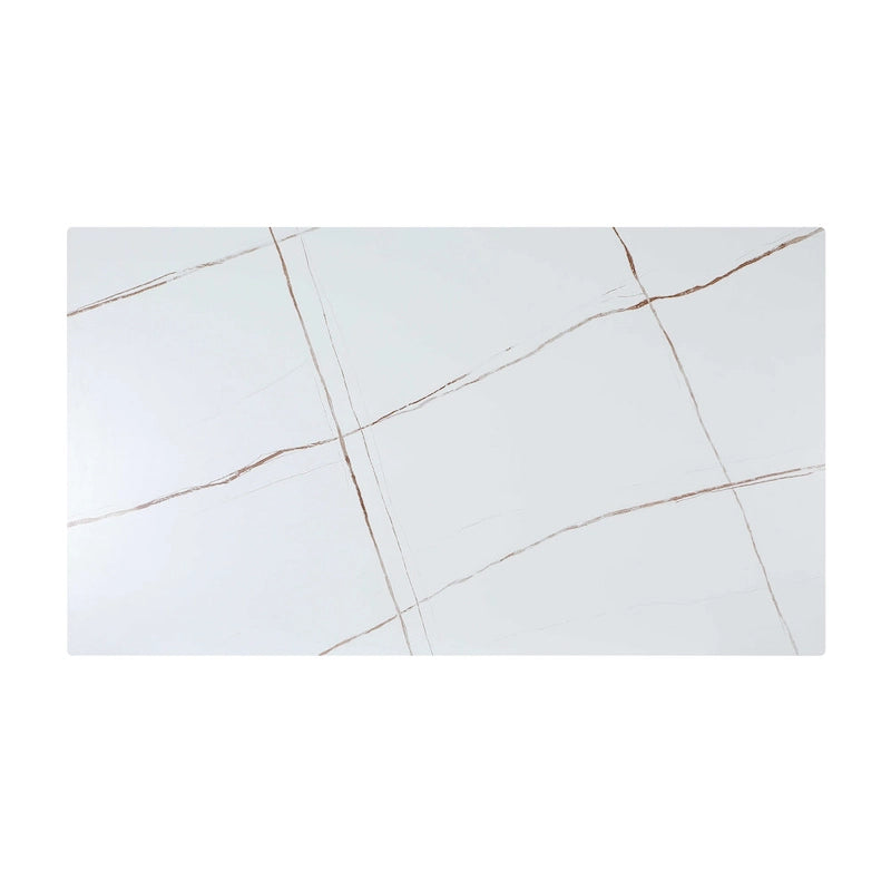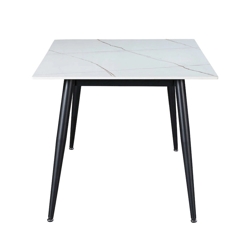 This contemporary dining table is a great dining room piece to add to your home. It features a 36 x 63 rectangular sintered stone slab in a marbleized matte white finish. The top is supported by a steel four-legged base with a matte black finish. While having a simple design, the contrast in colors also adds great style.